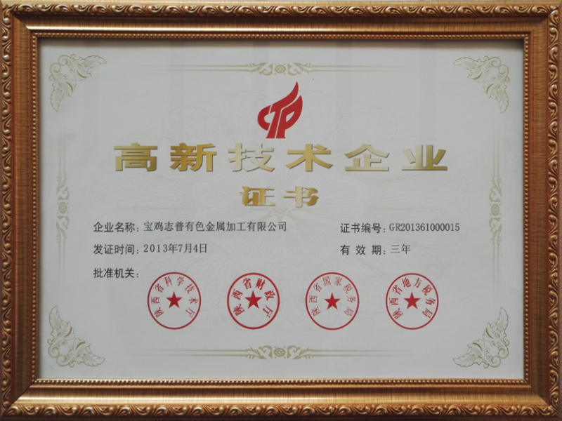 2013年7月,寶雞志普有色金屬加工有限公司被陜西省科學(xué)技術(shù)廳、陜西省財政廳、陜西省國家稅務(wù)局、陜西省地方稅務(wù)局聯(lián)合授予高新技術(shù)企業(yè)并頒發(fā)證書。