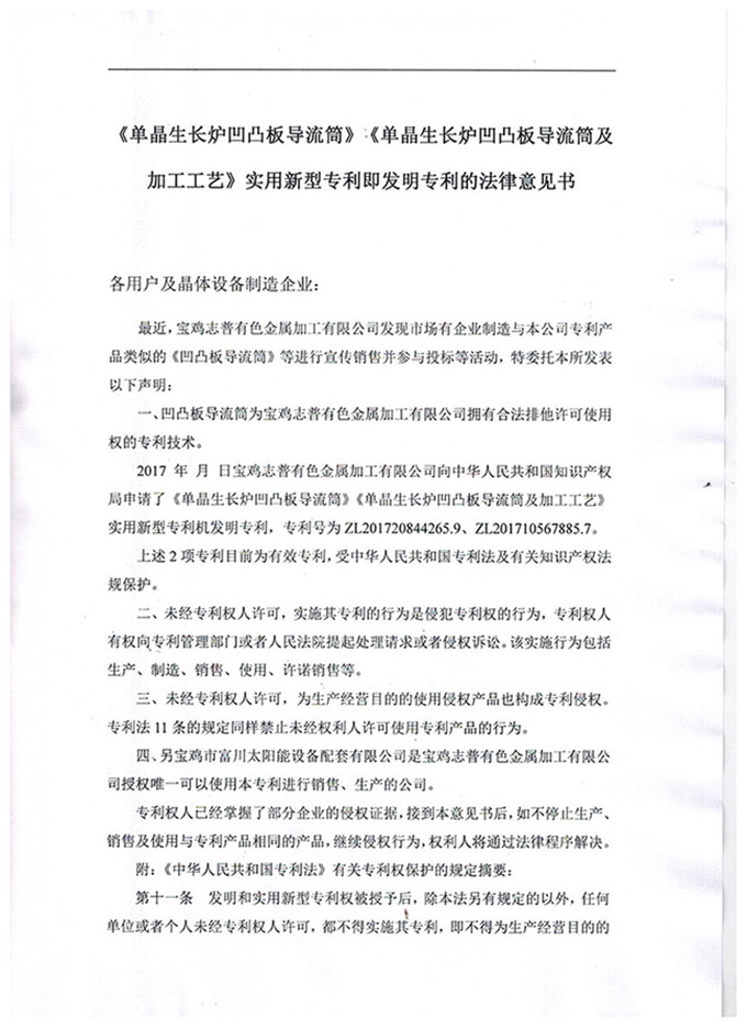 《單晶生長(zhǎng)爐凹凸板導(dǎo)流筒》發(fā)明專利的法律意見(jiàn)書